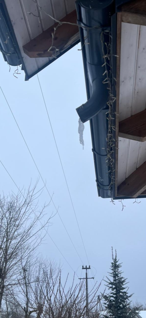 - Sople na okapie i lód w rynnach.