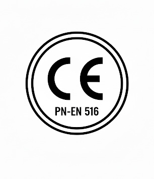 - CE to deklaracja producenta – potwierdza spełnienie podstawowych wymagań dyrektywy CPR (Rozporządzenie 305/2011 UE o wyrobach budowlanych), ale bez wskazania konkretnej normy zharmonizowanej (jak PN‑EN 516) nie dowodzi, że element spełnia techniczne parametry dla chodzenia po dachu.